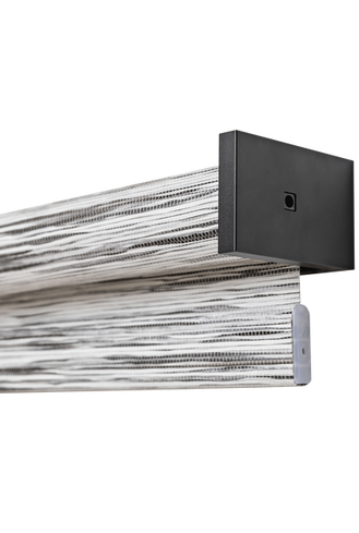Wooden box valance, wrapped in coordinating natural material, for a cohesive decorative accent